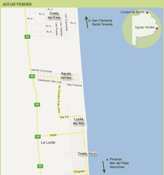 Ubicada a menos de 3km al sur de Aguas Verdes, podremos acceder a La Lucila del Mar en forma interna, la Av. Crucero conecta ambos balnearios o la RP11 que conecta todos los destinos de la Costa Atlántica.